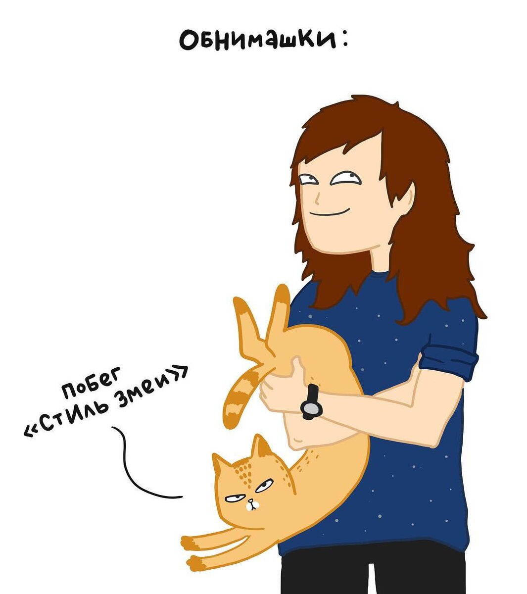 Наши котики всегда используют стиль змеи для побега — извиваются и выскальзывают из рук)) А ваши какой стиль используют?