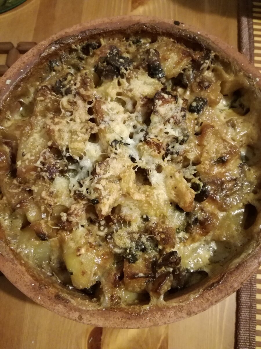 Самые вкусные блюда, бесспорно, запеченые в глиняной посуде. У меня всегда они вызывают ассоциации с чем-то теплым, уютным, домашним...Бабушкина стряпня, или маленькая деревенская таверна, или просто семейный ужин на небольшой теплой кухне))) Во время запекания по дому разносился такой аромат, что все домашние чуть не захлебнулись слюной в ожидании угощения. Попробуйте и вы этот замечательный рецепт! Нам понадобится: 4 картофелины 200 г грибов (шампиньоны) 150 г бекона 1 луковица несколько кусочков мягкого сыра немного тертого сыра несколько веточек петрушки 100 г сливок 22% жирности 200 мл воды Способ приготовления: Лук и грибы мелко нарезаем и обжариваем на сковороде на сильном огне Затем добавляем нарезанную кубиками картошку, продолжаем обжаривать в течение 10 минут, постоянно помешивая, солим мелко нарезаем бекон и петрушку и отправляем в сковороду, через 2 минуты выключаем огонь и перекладываем содержимое в высокую глиняную форму выкладываем первый слой и сверху несколько кусочк