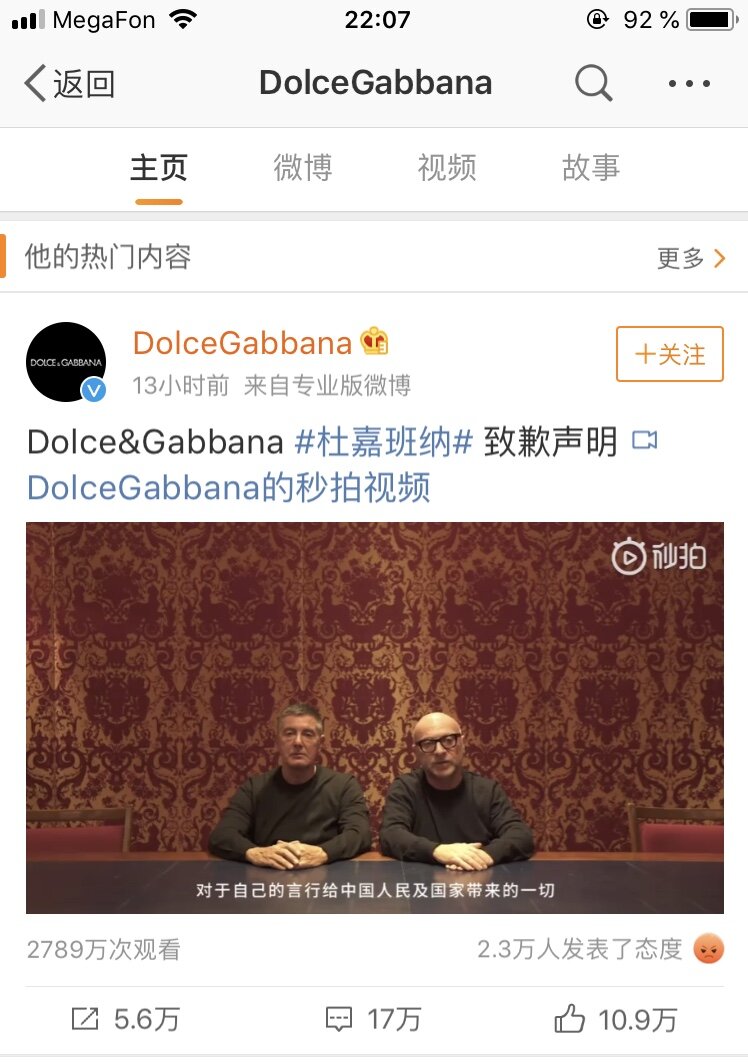 И вчера они вдвоем (Дольче и Габбана) выложили на Weibo и на Ютубе (а также картинку в инста) свое извинение в виде видео, в конце сказали по-китайски: