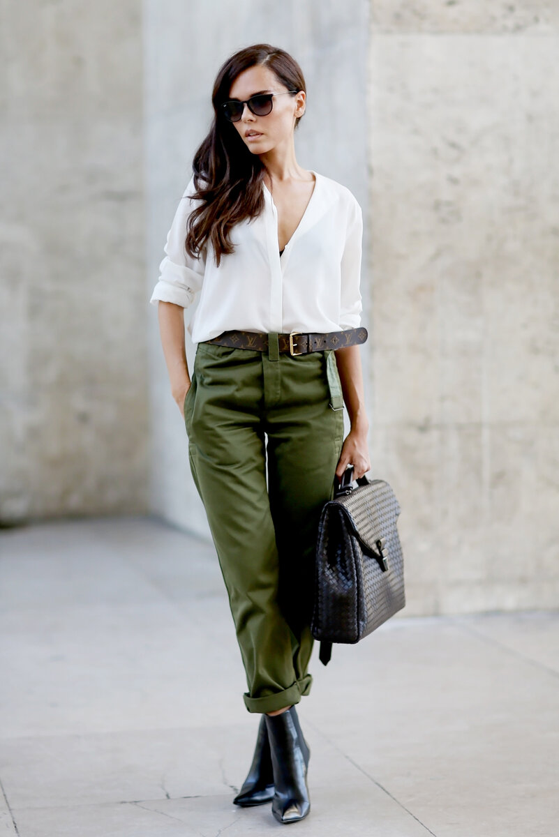 Женские брюки чинос имеют свободный силуэт, их ненавязчивый фасон вписывается в разные стили. Такие брюки подходят для работы, учебы и повседневных дел. Брюки чинос будут прекрасным дополнением стильному деловому образу. Практически во всех модных коллекциях можно найти брюки чинос. Это элегантные, хорошо сидящие на фигуре, свободные и не стесняющие движений брюки. Отличительная особенность брюк чинос — зауженность брючины книзу и длина, заканчивающаяся на уровне 5 сантиметров, не доходя до щиколотки. Брюки чинос самая демократичная модель брюк, они легко сочетаются со всеми стилями одежды. Без исключения. Они прекрасно сочетаются с туфлями на высоких каблуках, слипонами, кроссовками, кедами, ботиками и сапогами. Самые популярные цвета - зеленый, коричневый и оливковый. Обычно брюки чинос шьют из хлопка, но так же они могут быть из льна, атласа, шелка и шерсти. Ещё несколько образов с брюками чинос: Стильные и модные выкройки с изюминкой в каждой детали. Только лучшее! Подписыва