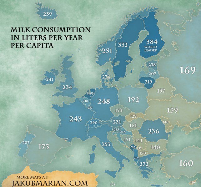 Пить или не пить молоко. Дискуссии по этому вопросу не утихают в мире. Существуют совершенно противоположные мнения на этот счет. В одном все сходятся: полезных витаминов и минералов в молоке много, а кисломолочные продукты усваиваются совсем по-другому, чем молоко, сохраняя все полезные свойства. Карта потребления молока цифрами говорит о том, что люди спорят, дискутируют, а молоко пьют. Лидер по выпиванию молока – житель Финляндии. 384 литра в год на лицо – это больше, чем 1 литр молока в день. Совсем не мало. Сухой закон стимулирует? Или наоборот, финны молоко мешают с водкой;) Восточная Европа отстает в потреблении молока от Северной и Центральной. Средний Россиянин из Европейской части страны выпивать почти в два раза меньше финна – 169 литров в год. Несколько фактов для размышления о молочном настоящем планеты: ВОЗ (Всемирная ассоциация здравоохранения) рекомендует потреблять около 330 килограммов молочных продуктов (в пересчете на молоко) в год. Если сравнить с этой цифрой, т