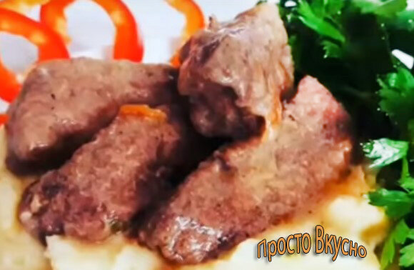 Приготовление говяжьей печени не требует много времени. Делюсь рецептом как сделать ее очень нежной, а не жесткой, ну, и, конечно, вкусной. Нам понадобиться: Печень говяжья - 500 гр. Луковица (крупная) - 1 шт. Морковь (средняя) - 1 шт. Соль по вкусу. Лавровый лист - 1 шт. Сметана - 2 ст.л. Мука для обвалки печени. Растительное масло для жарки. Процесс приготовления: 1. Не до конца оттаявшую печень очистить от плевы (пленочки сверху). 2. Нарезать на кусочки. Куски делать сильно мелкими не нужно, чтобы они получились сочными. 3. Каждый кусочек обвалять в муке и обжарить на растительном масле в заранее разогретой духовке. Обжарить чуть-чуть, чтобы образовалась немного корочка с обеих сторон. Внутри должна остаться сырая! Печень можно выложить в кастрюльку, где будем потом тушить. 4. Обжарить лук (кубиками) на отдельной сковороде. 5. Добавить к луку натертую морковь. Сделать зажарку (2 минуты). 6. После готовности зажарки, добавить ее к печени сверху. Залить кипятком так, чтобы печень не