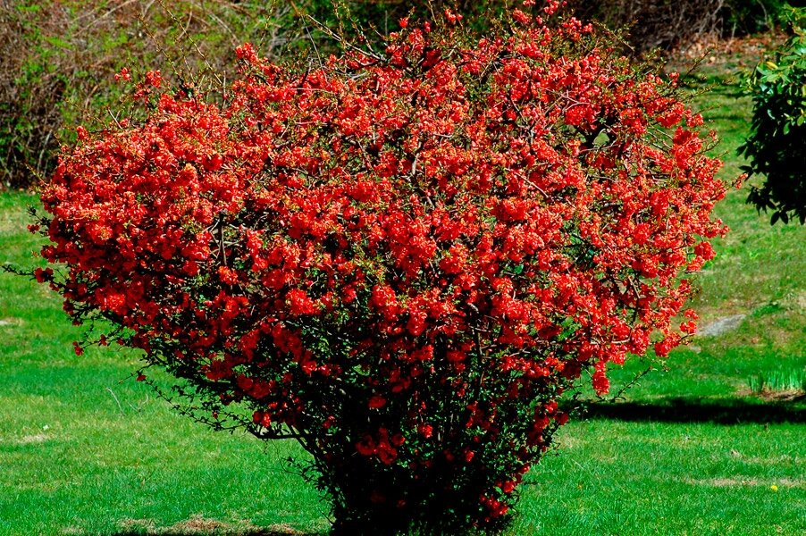 Айва японская, или хеномелес. Хеномелес японский - его второе, менее распространённое название - с настоящей айвой находится в отдаленном родстве. Предпочитает солнечное место. Требует богатых почв, подкормок и обильного полива в засушливые периоды. Обладает высокой морозостойкостью. Пересаживать растение лучше осенью или ранней весной до распускания почек. При обрезке следует учитывать, что максимальное количество цветковых почек закладывается на трехлетних побегах. Хеномелес- невысокий кустарник высотой до метра, цветущий в начале лета красно оранжевыми цветами диаметром до 5 см.Буйное цветение продолжается в течение 3 недель,нижняя часть света условно унизаны огненными соцветиями.Образуются цветы на старых побегах, ближе к основанию куста, особенно на тех, которые стелются по земле и зимой бывают покрыты снегом. Осенью на месте бывших сверху созревают плоды яблочки, съедобные и очень полезные, богатые витамином C. Для плодоношения хеномелес необходимо иметь на участке не менее