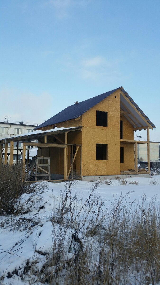 Вышло градусов 18 где-то. (прям уже нормальный такой колхоз строй пошел). Стропила решил укрепить дополнительными подпорами, где-то на расстоянии 1.5 метра от стены дома к трем стропилам крепил доску и один подпор к ним, который упирается в стойку дома, чтобы более усилить под него к стене набит брусок, все равно потом еще эту стену утеплять буду. На все про все ушел куб 150 доски и пол куба дюймовки. Вся крыша вместе со стропилами вышла в 29 тысяч.
