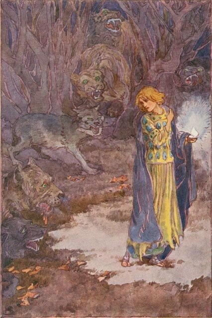 Она проснулась только тогда, когда первые рассветные лучи разорвали покров темноты той ночи, положив конец всем вещам, плохим и хорошим. Она проснулась, и перед её глазами открылся вид одновременно ужасающий и великолепный. Вокруг неё, десятью расширяющимися кругами сидели неисчислимые дикие звери: чёрные пантеры и тигры, пятнистые леопарды, огромные бурые медведи с большущими головами, но самые ужасные, чем все вокруг, были громадные змеи. Корона сидела, и пугающая действительность возвращалась в её пробуждённый разум. Но её маленькая лампа всё ещё отважно горела рядом с ней, хотя свет уже тускнел перед наступающим рассветом.