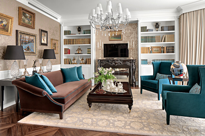 Команда архитектурного бюро «Альба Дизайн Проект» разработала для своих давних заказчиков проект городской квартиры в стиле американская классика. Хозяева квартиры хотели создать в интерьере лёгкую и уединённую атмосферу. При оформлении интерьера дизайнеры предложили классическое направление, основанное на американской традиции: с изящным лаконичным декором, в спокойной, но выразительной цветовой гамме. Объединив две квартиры, авторы проекта получили единое пространство площадью около двухсот квадратных метров. На них предстояло выстроить сложную планировочную композицию, которая включала бы в себя не только зону дневного пребывания и приватную часть, но и самостоятельный гостевой блок с отдельным входом. Ещё одним усложнением задачи было оборудование библиотеки, книги для которой собирали несколько поколений семьи хозяев. Ей отвели ключевую роль в планировочном решении, превратив в «узел», связывающий приватную часть квартиры, гостиную и входную группу. Стены восьмигранного объёма