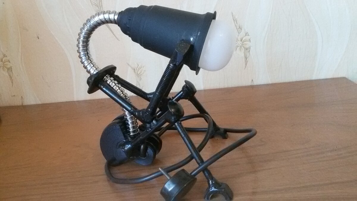 Приветствую на моем канале, друзья. Сегодня я расскажу, как из подручных средств можно собрать прикольную настольную лампу. Для начала нужно определиться с материалом. За основание я выбрал старый коленвал от бензопилы, спилил шатун и отпилил хвостовики по бокам, оставив по полтора сантиметра для крепления будущих ног. После этого взял мебельные шпильки со шляпками и болты подходящей длинны. Выставил произвольный угол на глаз и прихватил все это дело сваркой. Потом взял гайку, распилил ее по углу граней пополам и приварил к концам болтов. Так получились ноги будущего светильника. Осталось приварить к коленвалу обрезок болта, для крепления "позвоночника" и на этом нижняя часть закончена. Переходим к верхней части: В качестве плечиков выбрал пластинку, некогда бывшей клином для расклинивания топора, просверлил два отверстия по краям (центральное отверстие уже было) и вставил в них два болта произвольной длинны , и приварил к середине бедренных болтов. (см. фото). После взял еще два