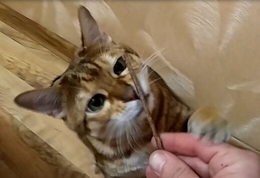Вчера Папан, глава прайда нашего, с улыбкой до ушей притащил в дом какой-то хворост. Ну как хворост, пакетик палочек каких-то, якобы для нас котов. Мы с Бетюней ребята любопытные, сразу прогуглили, что это за хрень такая и почему добропорядочный домашний кот должен грызть какие-то там палки. Товарищ Гугл, пошевелив своими электронными мозгами выдал нам информацию, что палочки эти из Китая и пропитаны какой-то там мятой. Мы ещё не успели обсудить с Бетти, а оно нам надо? Как наш Глава, уже пихает палки нам в рот, лучше бы колбаску так пихал, жлоб несчастный. На котиках экономит, решил накормить нас китайским лесом, а мы коты не травоядные нам мясо нужно, ну на кройняк колбаса. Переглянулись мы с Бетюней, делать нечего, придётся пробовать, а то ведь не отстанет. И чего бы ему самому не погрызть, может древесины в мозгах прибавится и он в следующий раз вместо дров, колбасы или сыра домой принесёт. Так эти палки ещё и пахнут чем-то. Ох в голове, что-то шумит, как после валерьянки, хочется