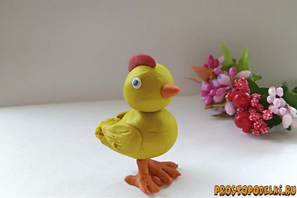 На итоговом фото данного мастер-класса представлен маленький цыпленок. Это птенчик домашней птицы, который известен всем детям. Все куриное семейство важно ходит по двору перед курятником под предводительством петуха. Детям нравится возиться с мягкой массой, создавать знакомые объекты, поэтому они с удовольствием слепят такую поделку из пластилина. Подробный урок будет актуален, если вас интересует лепка для детей младшей группы детского сада. Также вы можете дома позаниматься с малышами творчеством, используя наборчик пластилина. Слепить цыпленка просто, фигурка сложена из совсем простых деталей, которые выполняются совсем несложно. Юным творцам всегда нравится создавать что-то своими руками, заниматься предметной лепкой под предводительством учителей или родителей. Что необходимо подготовить для лепки цыпленка из пластилина: Как слепить цыпленка поэтапно: Переходите к интересной работе. Желтый пластилин – основной цвет, его чаще всего используют, если речь идет о лепке цыпленка. Пред