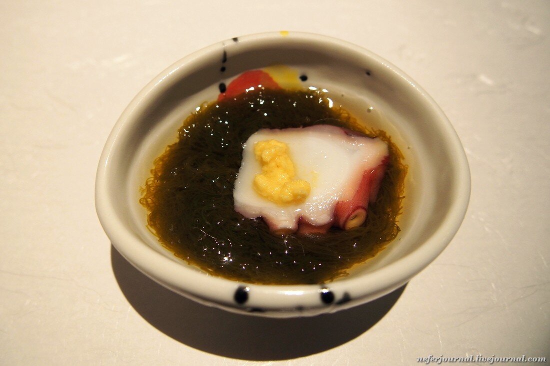 В Японии перед едой часто подают otoshi. Во многих ресторанах есть table charge - дополнительная плата за посещение заведения, и закуска как бы оплачена этими деньгами. В нашем случае это было mozuku с кусочком осьминога и имбирем. Отважились бы это съесть?