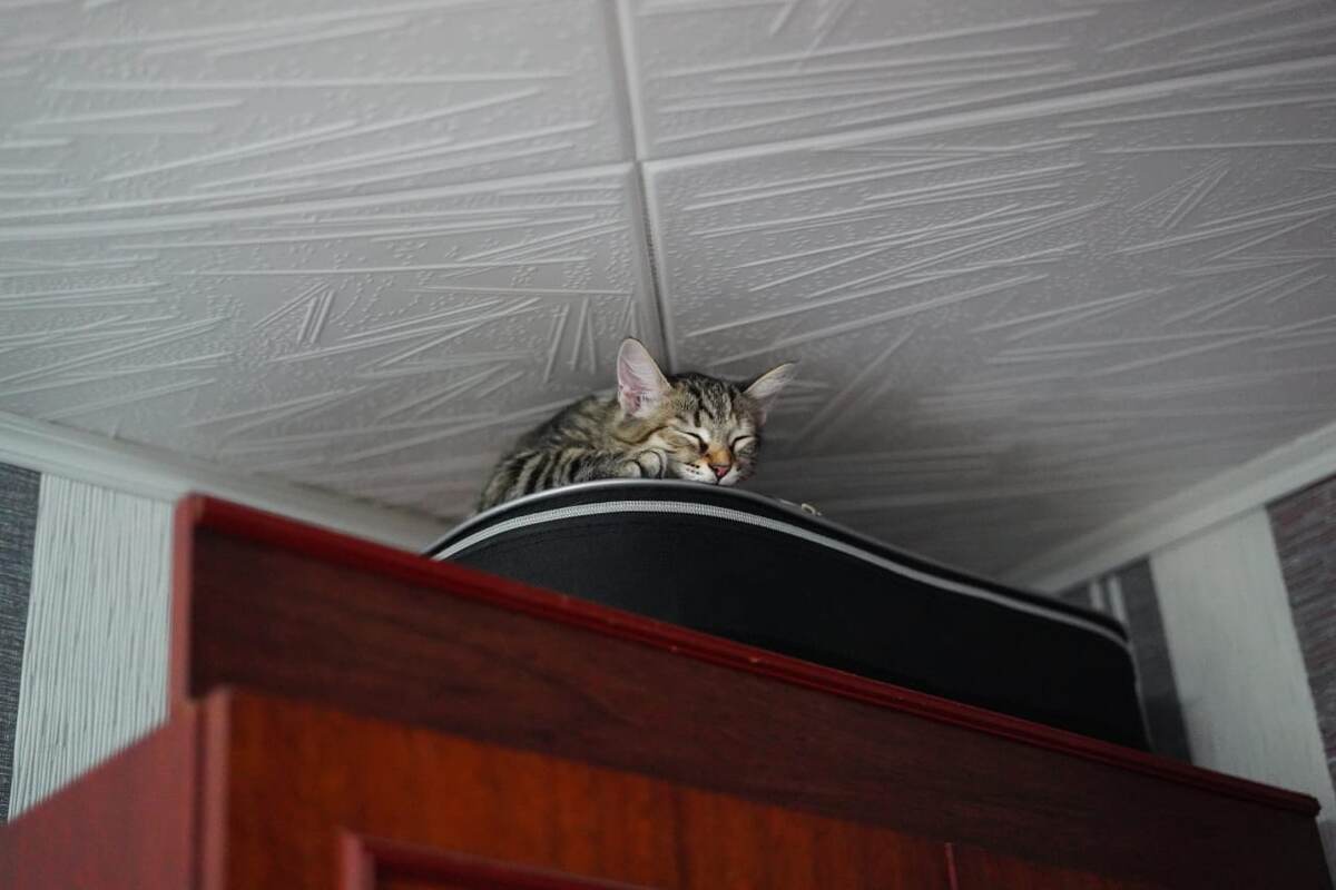 В нашем доме с появлением Маруси, как и в доме с маленькими детьми, с наступлением затишья приходит настороженность: "Где-то будет пакость?!" А наша маленькая пакость просто изобретательница. А тут в доме тишина... Зловещая?... Ищем свою деточку... Ну кто бы стал искать ребёнка под потолком? Мы практически с ног сбились и на измену подсели: куда наша деточка подевалась. А она всё это время, что мы носились по квартире спокойно дремала под потолком. Ну и как ругаться на ребёнка? Особенно спящего мирным сном. И даже на нас не реагирует. Видать здорово умаялась.