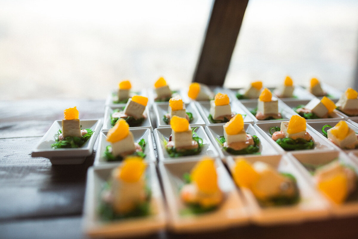 Заливное – еще одна традиционная новогодняя закуска русского стола, популярности которой мы обязаны известному советскому фильму. Заливное в форме золотистой рыбки от нашего шеф-повара захотят попробовать даже те, кто не питал интереса к этому блюду раньше. Не менее аппетитно выглядит заливное из трех видов мяса. Также мы предлагаем заказать порционное заливное, сервированное в прозрачных шотах, что уместно при организации новогоднего фуршета. - Канапе