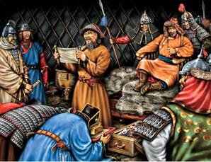 В конце ХII в. у многочисленных монгольских племен (меркитов, кереитов, ойратов, найманов, татар), кочевавших на огромных просторах Центральной Азии, начался процесс зарождения государственности, проходивший в жестокой междоусобной борьбе, победу в которой одержал один из монгольских ханов Тэмучэн (1150/60–1227 гг.). В 1206 г. на курултае монгольских ханов и нойонов в верховьях реки Онон Тэмучэн был провозглашен «великим ханом всех монголов» и получил новое имя Чингисхан. Возглавив единое монгольское государство, Чингисхан провел широкомасштабную военную реформу, в ходе которой была создана одна из самых боеспособных армий мира. Эта армия, ставшая опорой власти Чингисхана, имела четкую структуру (делилась на десятки, сотни и тысячи), отличную боевую выучку, новейшее вооружение (саблю и саадак) и строжайшую дисциплину. После завершения военной реформы Чингисхан начал свои знаменитые завоевательные походы: в 1211–1216 гг. монголы завоевали маньчжурские провинции Китая, в том числе столиц