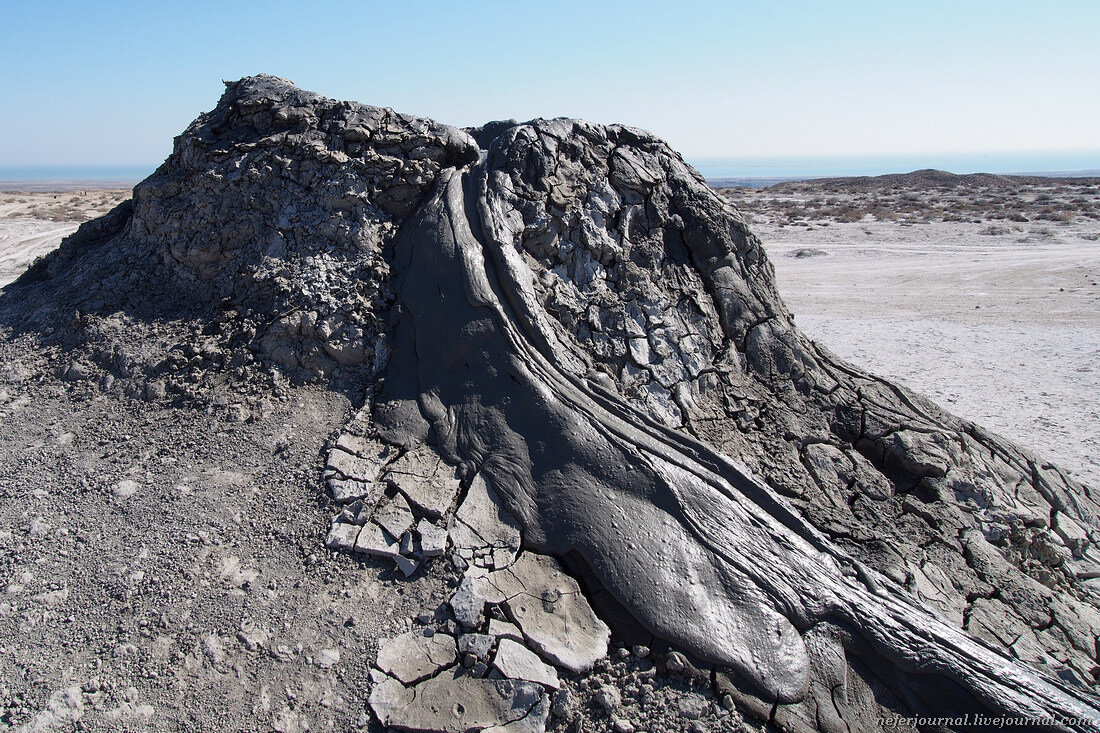 Недалеко от Баку есть интересное место. Представьте, серая пустыня, в которой понатыканы конусы разных размеров. Забираешься на горку, в воронке бурлит грязь. Стоит замешкаться и подойти слишком близко, она ка-ак плюнет. Я попалась.