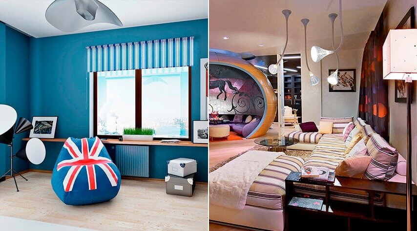 - броские акценты, используемые в покрытии стен, пола, декоре мебели, текстиле: кадры из кино, рисунки из комиксов, афиши с портретами кумиров,