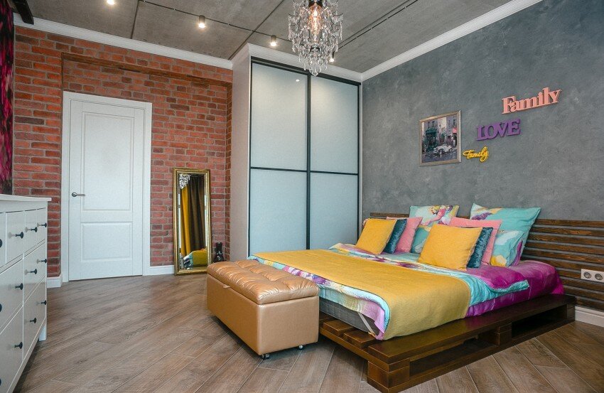 На дизайн спальной комнаты значительное влияние оказывает ее площадь. Как показано на фото спальни в квартире, если помещение довольно просторное, то его оформление допустимо разбавить яркими акцентами. Это могут быть пёстрые вставки или детали тёмных оттенков – кроватное покрывало, обивка пуфа, занавеси.
