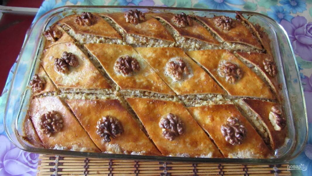 Я сладкоежка и поэтому мне очень понравился этот рецепт пахлавы с которым хочу поделится с вами. ИНГРЕДИЕНТЫ ТЕСТО: Мука - 500 г Яйцо - 2 шт. Сметана - 150 г Молоко - 150 г Сливочное масло - 50 г Дрожжи - пол-пачки сухих (5-6 г) или 15 г свежих Соль - щепотка Сахар - 1 ч. л. НАЧИНКА: Грецкие орехи - 250 г Сахарная пудра - 250 гСливочное масло - 250 г Кардамон - 0,5 ч. л. Корица - 1 ч. л. Ваниль ВЕРХ: Яйцо взбитое - 1 шт. Грецкие орехи (половинки) СИРОП: Мед - 150 г Горячая вода - 90-100 мл Как приготовить пахлаву медовую:
