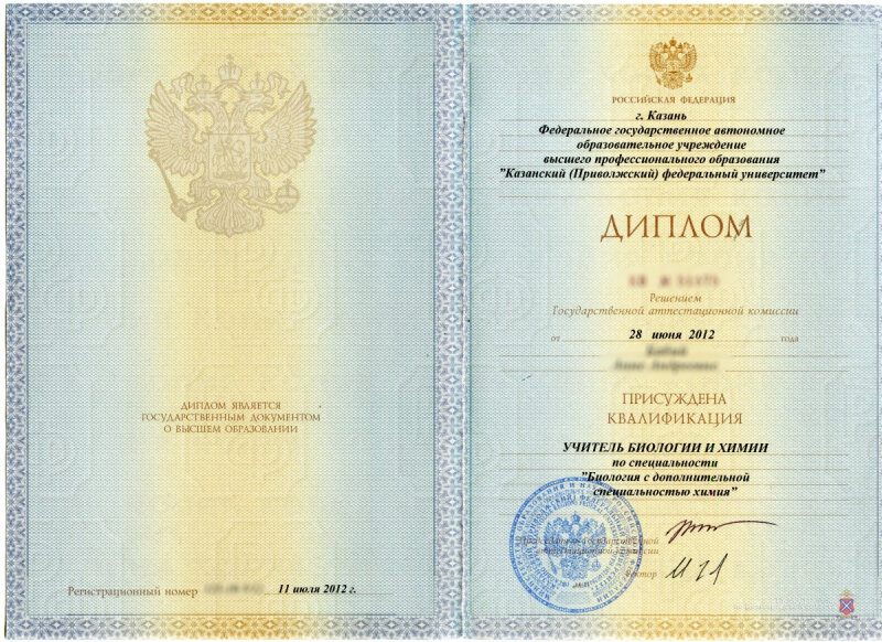 Учительница биологии, химии и английского языка предоставила в отдел кадров документы об окончании Сургутского университета по специальности биолог-эколог, а также документы по переподготовке специалиста по преподаванию английского языка и диплом Казанского Федерального университета о присуждении квалификации учитель биологии и химии, а также диплом об окончании Волгоградского государственного социально-педагогического университета по специальности педагог-дефектолог.