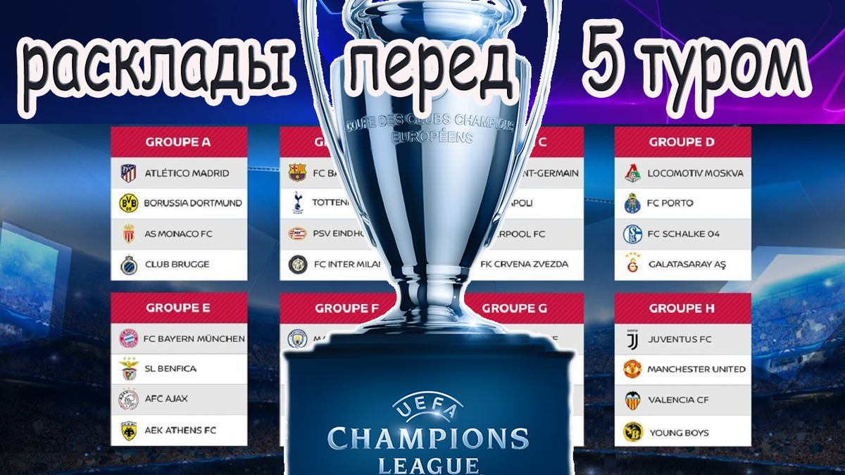 Ну, а чтобы бы с расписанием 5 тура все было понятно, во вторник сыграют 2 матча по раньше, АЕК Аякс, а ЦСКА Виктория. Остальные игры вторника на 2 часа позже. Можно выделить интересную игру Бавария Бенфика, и Рома Реал. В среду Атлетико Монако, Локомотив Галатасарай. В 9 вечера по Москве, И в 11 вечера выбирайте: Тоттенхэм - Интер игра за 2ю путевку в группе, ПСЖ Ливерпуль матч грандов, Порту Шальке также игра за 1е место.