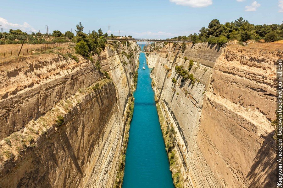 Коринф в древней Греции был очень известным и богатым городом благодаря небольшой полоске суши, отделяющей Ионическое море от Эгейского моря. Плыть вокруг полуострова Пелопоннес было очень долго - примерно 400 км и опасно, поэтому в этом месте перетягивали корабли чтобы попасть из одного моря в другое. Соединить заливы между материком и Пелопоннесом в самом узком его месте хотели еще в 6 веке до н.э., а в 67 году н.э. даже предпринимали попытки начать строительство, которым было суждено закончиться только в конце 19 века. Коринфский канал - самый внушительный долгострой за историю планеты, чудо инженерный мысли и просто дивное место, поражающее контрастом лазурной воды и отвесными скалами находится недалеко от Афин. Изучая достопримечательности Греции, я наткнулся на его фотографии и решил, что должен увидеть это своими глазами.