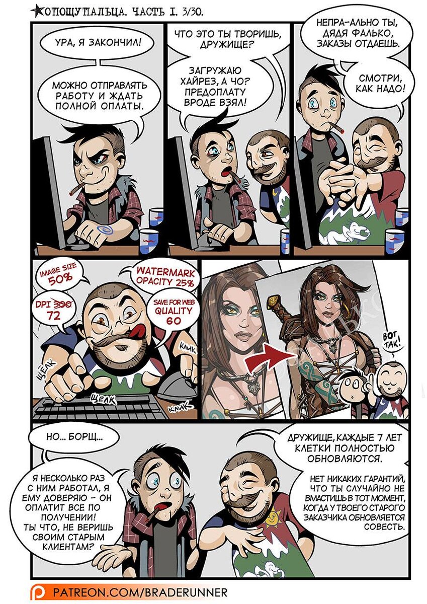 А я продолжаю следить за новыми выпусками веб-комикса Zhопащупальца и делиться с вами этой гадостью, матерно рассказывающей о проблемах современных диджитал-исполнителей во взаимоотношениях с клиентами, а также различным способам выживания голодного фрилансера, поиска им денег на еду, съем квартиры и личную жизнь. 1-й выпуск; 2-й. На этот раз стрип немного инсайдерский, скорее чисто для художников, если судить по сленгу.