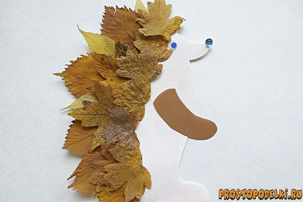 Поделки из осенних листьев – это прекрасные варианты для детского творчества. Можно считать природный материал бесплатным сырьем для работы. Вы можете насобирать целую охапку разноцветных листьев в любой день на прогулке, затем использовать их для удивительных поделок. Главное, правильно подготовить листочки: сначала высушить их между страничками старого журнала под прессом, а затем использовать в нестандартных поделках. Конечно, листочки изменятся, их оттенок потемнеет, но они не потеряют своей красоты. Их даже можно будет порезать ножницами, если вам нужно будет, как простую бумагу. В этом уроке показано, как сделать интересную аппликацию с ежиком. Колючки ежика выполнены из сухих листиков, а туловище просто нарисовано и вырезано из бумаги. Это поделка для самых маленьких детей. Материалы для создания осенней поделки: Как сделать ежика из листьев поэтапно: Подготовьте для работы листья. Если вы возьмете свежие листья, то они со временем деформируются и изменят свою форму, поэтому кол