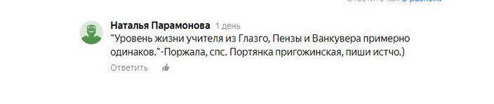 Прошлая статья «Поравалильщик уже не тот, что раньше», видимо, кое-кого из этих самых поравалильщиков так возбудила, что оно оставило даже комментарий: Госпожа Парамонова! Ржут лошади! Вы себя отождествляете с этим славным животным? Уверяю Вас, женщина или девушка, которая не смеется, а ржет – существо сугубо отталкивающее и неприятное, в отличие от лошади. Впрочем, если Вы себя таковой считаете, это Ваше дело. А что Вас смущает в сравнении уровня жизни учителей из Глазго, Ванкувера и Пензы? Вы считаете, что на 928 фунтов в месяц учитель в Глазго может позволить себе ежедневных лобстеров и «Бентли» к подъезду? Вы думаете, что учитель из Ванкувера ежегодно посещает модные курорты на свою заплату? Увы, Вам, Вы глубоко заблуждаетесь. Если бы у Вас было побольше мозгов, хотя бы как у лошади, Вы бы сначала узнали, как живут учителя за границей. Если нет возможности узнать из первоисточников, пошерстите тот же интернет. А если Вы удосужитесь поинтересоваться, пусть Вас не смущают