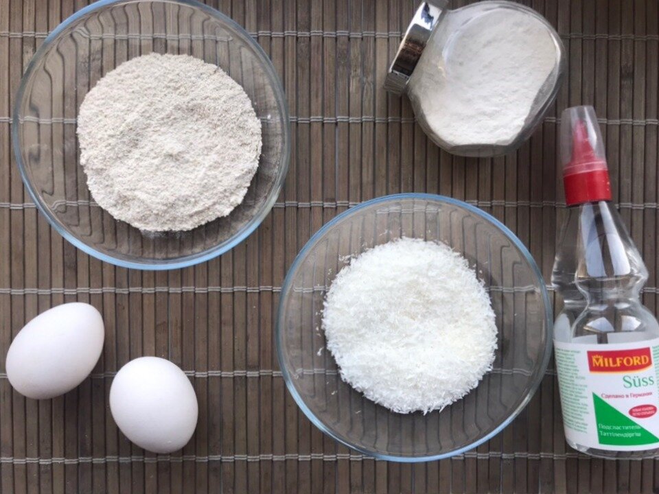 5. Подсластитель и ванилин (по вкусу) В данном случае производитель не имеет значение, все зависит от Ваших предпочтений. Я использую жидкий подсластитель "Milford". Овсяную муку можно приготовить самостоятельно. Для этого нужно предварительно измельчить овсяные хлопья с помощью блендера или кухонного комбайна. Шаг 1. Отделяем белки от желтков Шаг 2. Взбиваем белки до крепких пиков Шаг 3. Добавляем к белкам все остальные ингредиенты и перемешиваем до однородной массы. Шаг 4. Из получившейся смеси формируем шарики влажными руками, чтобы тесто не прилипало. Шаг 5. Выкладываем наше печенье на противень. Можно использовать бумагу для выпекания или силиконовый коврик. Шаг 6. Выпекаем кокосо