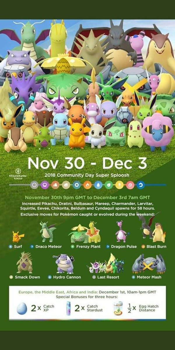 Заканчивается год и время вспомнить все дни сообщества, которые он в себя включил! С 01.12.18 00:00 по 03.12.18 10.00 (мск) будет увеличен спавн Пикачу, Дратини, Бульбазавра, Чармандера, Сквиртла, Марипа, Ларвитара, Иви, Белдума, Чикориты и Синдаквила и появится возможность получить эволюцией специальные атаки перечисленным покемонам как в их КД. ДОПОЛНИТЕЛЬНО: 1 декабря с 13 до 16 часов по Москве. будут работать следующие бонусы: • удвоенный опыт за поимку; • удвоенная пыль за поимку; • дистанция инкубации уменьшена в два раза; • трёхчасовые люры.