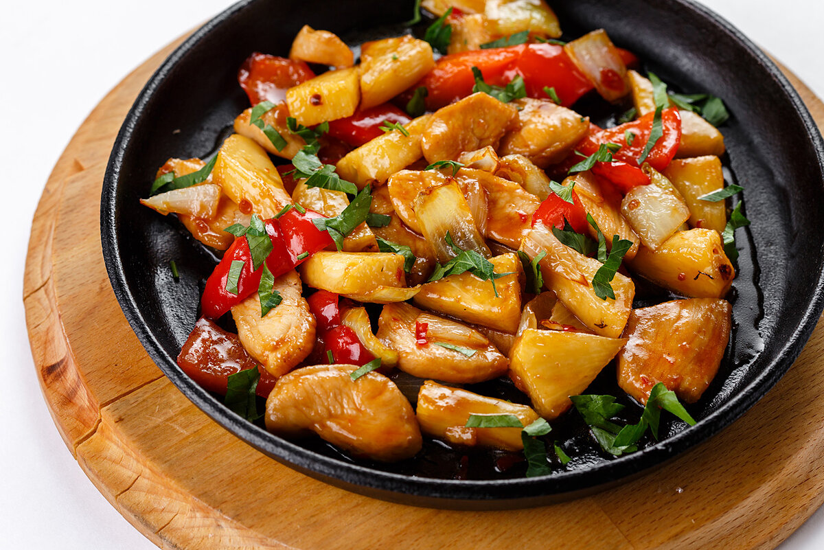 Подавать с рисом и ананасами.