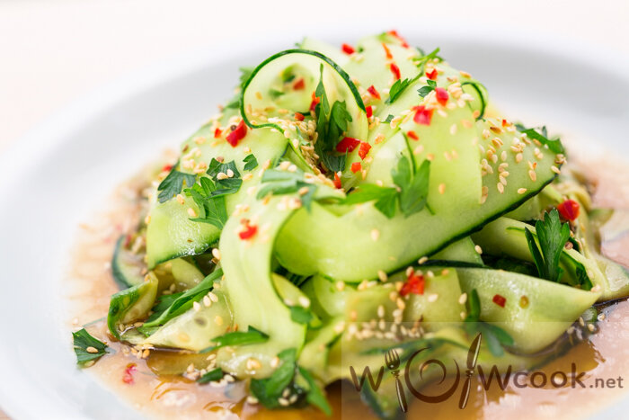 Ингредиенты: 6 средних огурцов; 1 лайм; 2 см колечко перца чили; 20 г корня имбиря; зелень петрушки; 3 ст.л. соевого соуса; 1 ст.л. растительного (лучше оливкового) масла; 0,5 ч.л. корендра; 15-20 г семян кунжута. РЕЦЕПТ ОСТРОГО САЛАТА ИЗ СВЕЖИХ ОГУРЦОВ. 1. Корень имбиря очищаем и натираем на мелкой тёрке. 2. Выжимаем сок, жмых выбрасываем. 3. Сок имбиря выливаем в миску, в которой будем делать заправку для салата. Туда же трём на мелкой тёрке немного цедры лайма. 4. Добавляем соевый соус и растительное масло, выдавливаем сок лайма, перемешиваем. 5. Семена кунжута с кориандром обжариваем на сухой сковороде на медленном огне приблизительно полминуты. Аккуратно, семена могут стрелять. Семена кунжута должны пожелтеть. 6. Крупно нарезаем зелень петрушки. 7. Измельчаем кусочек перца чили. 8. Огурцы нарезаем вдоль тонкими пластинками. 9. Нарезанные огурцы выкладываем на тарелку, придавая руками салату форму. 10. Поливаем огурцы заправкой. Посыпаем сверху кунжутом, петрушкой и красным пер