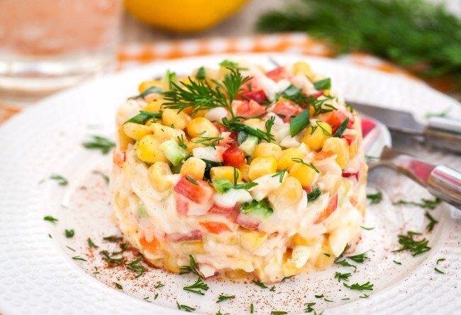 2. Укладываем салат слоями: 1-й — консервы, 2-й — лук, 3-й — майонез, 4-й — сыр, 5-й — кукуруза, 6-й —майонез, 7-й — крабовые палочки, 8-й — майонез, 9-й — белок + майонез. Посыпаем желтком, ставим салат в холодильник на 1 ч