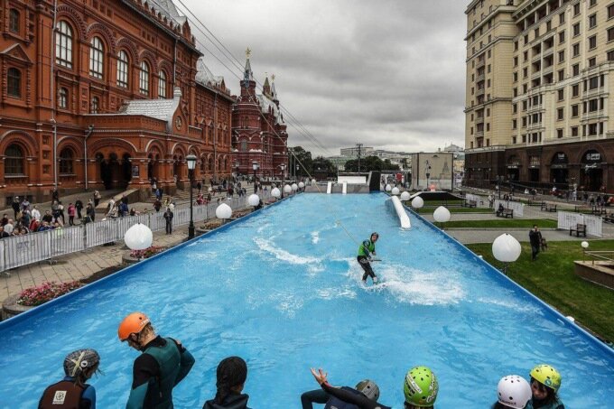 К 870-летию Москвы на площади Революции установили бассейны для вейкбординга