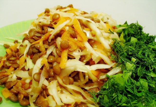 Салат из чечевицы с квашеной капустой – 4 порции. Ингредиенты: 90 г чечевицы, ½ бульонного кубика, 1 чайная ложка зёрен фенхеля, 1-2 красные луковицы, 90 г квашеной капусты, 1,5 столовые ложки оливкового масла, 1,5 столовые ложки уксуса, соль, молотый чёрный перец. Способ приготовления 1. Сначала замочить чечевицу в чистой воде на несколько часов. Затем эту воду слить, а в кастрюлю с чечевицей положить половинку бульонного кубика и зёрна фенхеля. 2. Налить свежей воды так, чтобы чечевицы была покрыта водой. Затем довести содержимое кастрюли до кипения и после этого варить до готовности на маленьком огне 10-15 минут при закрытой крышке. Следите за тем, чтобы вода не испарялась слишком быстро, иначе чечевица может подгореть. 3. Если вода во время варки полностью не испарится, то её надо слить через сито. 4. В это время нарезать лук маленькими кубиками. Если чечевица готова, добавить в неё лук и готовить примерно 2 минуты при постоянном помешивании, чтобы вкус чечевицы несколько смягчился