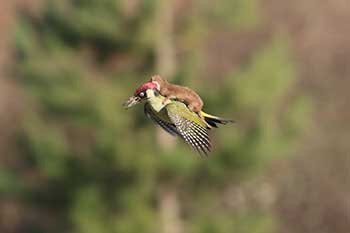 В одном из парков Лондона фотограф Мартин Лэ-Мэй сделал фото, как ласка летела на спине у дятла. Как она оказалась на спине у птицы, точно, не известно, однако ласки часто разоряют гнезда птиц и такой полет, скорее всего, стал окончанием схватки между дятлом и лаской. Полет продолжался не долго, так как ласка долго не смогла удерживаться в «седле», через несколько секунд упала на землю.