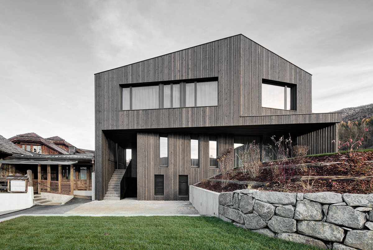 Casa M — семейная резиденция в Рисконе, небольшом курортном посёлке на севере Италии. Двухэтажный дом из бетона и дерева решён Comfort Architecten как цельный компактный объём, ощущение монолитности которого усиливается благодаря однородной облицовке фасада и крыши лиственничной доской. Главный вход в здание расположен на первом этаже, к нему ведёт открытая лестница. Здесь же находятся гостиная, совмещённая со столовой и кухней, и ванная комната. К гостиной примыкает большая терраса, что добавляет дому ощущение большего комфорта. На втором этаже есть три спальни и две ванные комнаты. С северной стороны существует и второй вход, ведущий в расположенную в полуцокольном этаже квартиру-студию. Там же находятся некоторые вспомогательные помещения. Решение интерьеров строится на контрасте фактур: изготовленная по особой технологии штукатурка в облицовке стен и потолка на первом этаже подчёркивает несущую конструкцию из лиственницы и бетона, в то время как пол, двери и мебель выполнены из ду