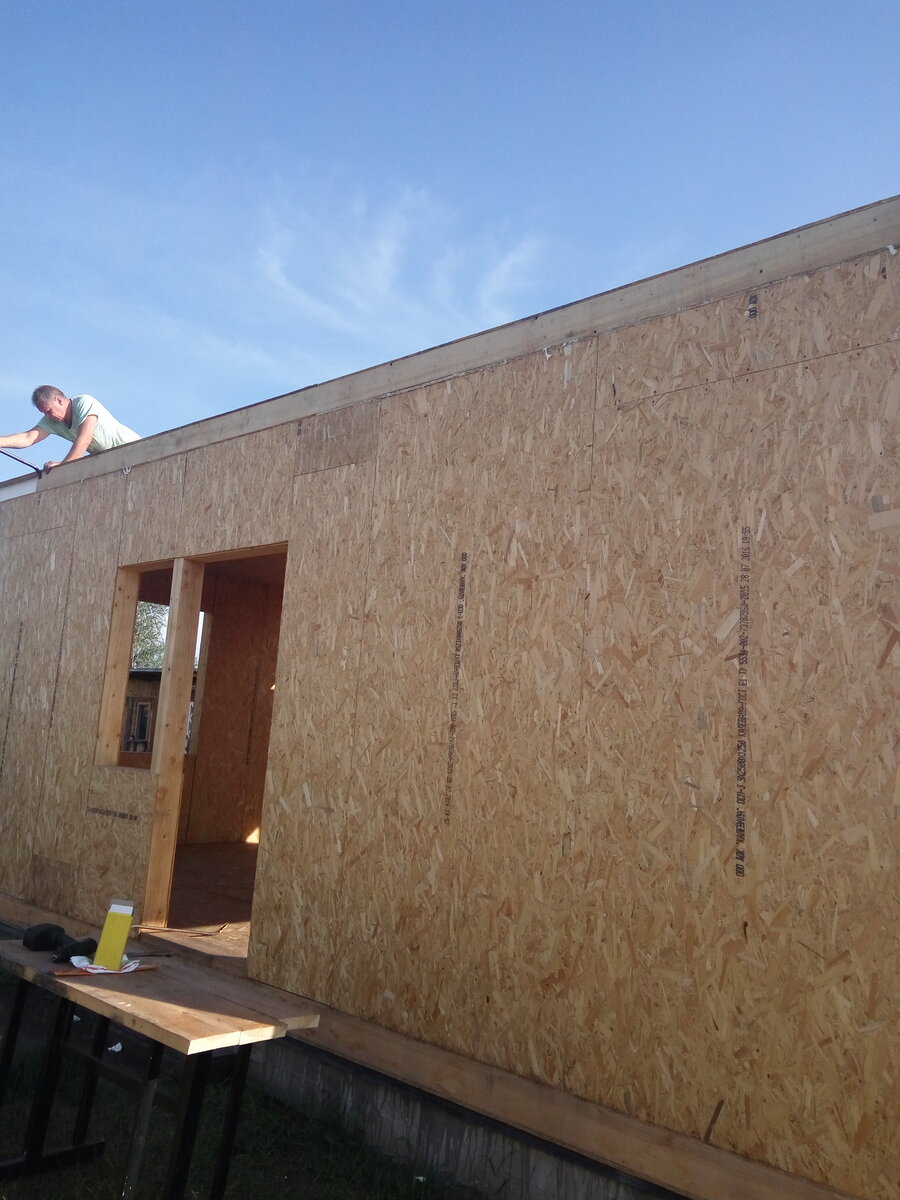 Я уже показывала на фото ход строительства дома из сип панелей. 1 этаж построен буквально за несколько дней силами 2 мужчин. Зашили проемы "печенек" сип панелей. Коробка выглядит как-то так: Я уже бродила счастливая по углам нового дома. Первый дождь с ветром дал откровенно понять, что это строение - не есть укрытие. Дождь захлестывал и в оконные и в дверной проём. Укрыться было негде. По принципу заливания полов 1 этажа я надеялась, что со 2 этажа будем сметать лужи. Нас уверили, что это уже вариант для проживания. Достаточно укрыть тентом, либо рекламным банером. Мы купили строительный тент. И стали закрывать периметр. Я наивно рассчитывала, что входная дверь обойдется в 10 - 11 тысяч рублей... Обладатели таких дверей поделились печальным опытом с необходимостью замены дверей бюджетного варианта (Рассыпались резиновые уплотнители и что-то ещё о чём врать не буду). Решили, что мы не настолько богаты, чтобы покупать дешёвые вещи. Купили дверь с терморазрывом. Вес двери - проверка н