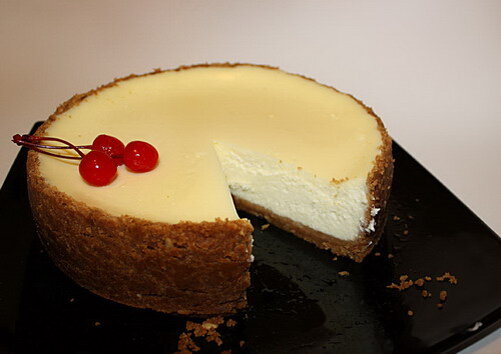 Постепенно добавляем сливки, яйца и ваниль. Стараемся не перевзбить массу — если смесь будет перенасыщена пузырьками воздуха, при выпечке чизкейк может вздуться и треснуть. Заливаем сырную смесь в форму. Оборачиваем форму двойным слоем фольги, чтобы в нее не затекла жидкость, ставим в другую форму большего диаметра и наливаем в последнюю столько воды, чтобы она доходила со середины бортиков формы с чизкейком. Отправляем в разогретую до 160 градусов духовку на час и 20 минут. По истечении этого времени выключаем духовку, приоткрываем дверцу и оставляем так еще на час. После этого вынимаем чизкейк и ставим в хол