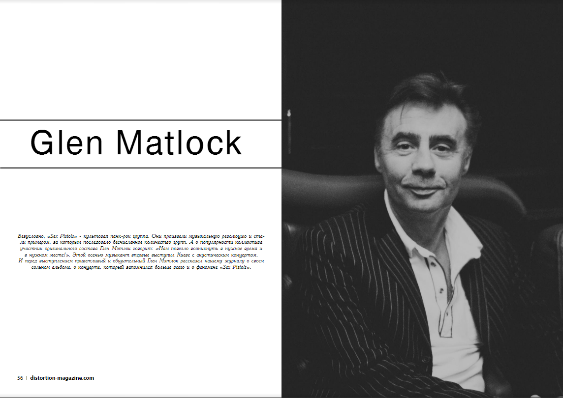 Безусловно, Sex Pistols – культовая группа. Они произвели музыкальную революцию и стали примером, за которым последовало бесчисленное количество групп. А о популярности коллектива участник оригинального состава Глен Мэтлок говорит: «Нам повезло возникнуть в нужное время и в нужном месте!». О феномене Sex Pistols, современном панк-роке и сольных работах Глена Мэтлока, читайте в архивном интервью журнала Distortion. (Интервью было сделано в 2012 году накануне сольного концерта Глена Мэтлока в Киеве) Здравствуйте. Глен, это ваш первый день в Киеве? Вам уже удалось осмотреться и познакомиться с городом? Добрый вечер! На самом деле, это уже мой второй концерт – я играл вчера здесь же, но это было приватное мероприятие. Поэтому, сегодня я снова выступлю с аналогичной программой, но для более широкой публики. Вы знаете, пока мне не удалось ознакомиться с достопримечательностями Киева. Я лишь прошелся по центральной улице и поднялся к мемориальному парку, расположенному неподалеку от этого