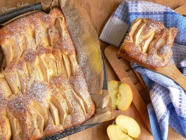6. Выпекать пирог при 180 градусах до золотистого цвета. Перед подачей посыпать сахарной пудрой.
