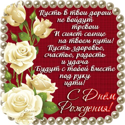 🌹🌹🌹🌹🌹🌹🌹🌹🌹🌹 🍰Как роза в капельках росы, Пусть будет счастье нежным, Как небо цвета бирюзы,🌈 Бескрайним и безбрежным!✨ 🍓И будет жизнь полна тепла, Улыбок, восхищенья,💐 Прелестна, радостна, светла Всегда, как в День Рожденья!🎉 Ещё похожие поздравления
