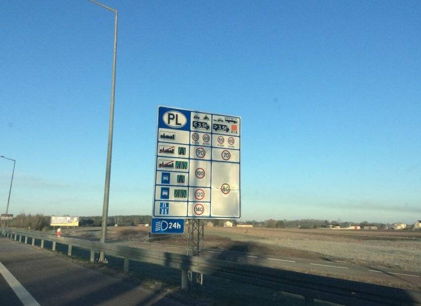 Первое, что встречает водителя, въезжающего в Польшу, — информационный щит, вкратце разъясняющий раздел ПДД скоростного режима и вопрос оплаты дорог.