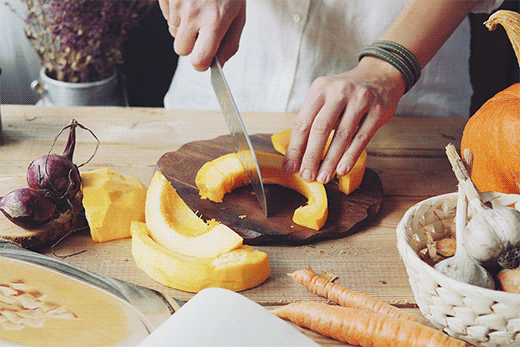 Заправляем оливковым маслом, солим–перчим, запекаем на противне вместе с луковицей (не все любят — можно и без него) и парой головок чеснока (тоже на любителя). Всё это запекается до мягкости тыквы.