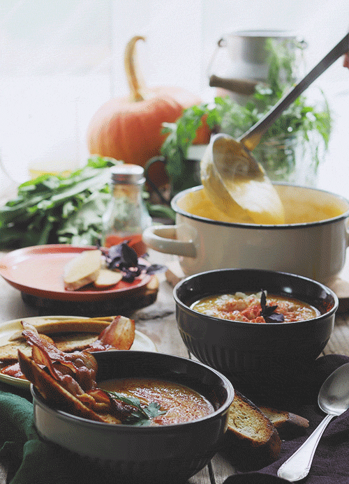 Можно доставать крутоны, зажаренный бекон, рвать травки, резать брынзу