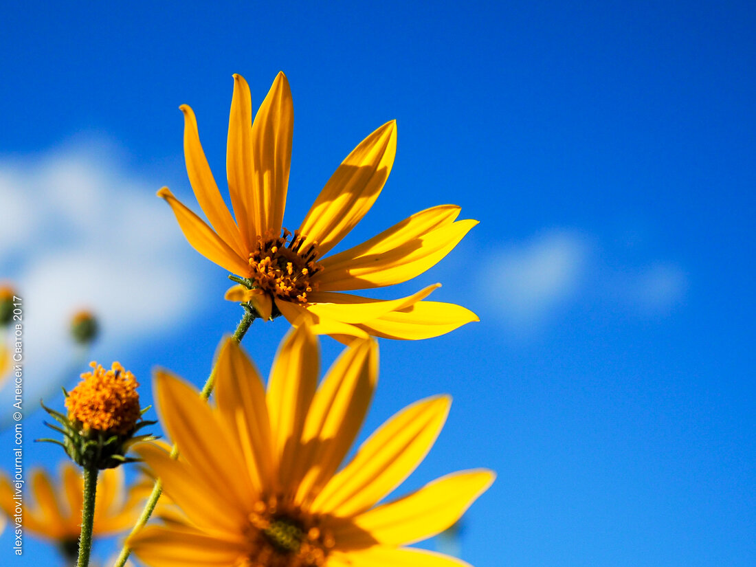 Подсолнухи и маки рядом с ним блекнут. Самый яркий, насыщенный и интенсивный жёлтый цвет в любую погоду, хотя в пасмурную даже интенсивней.