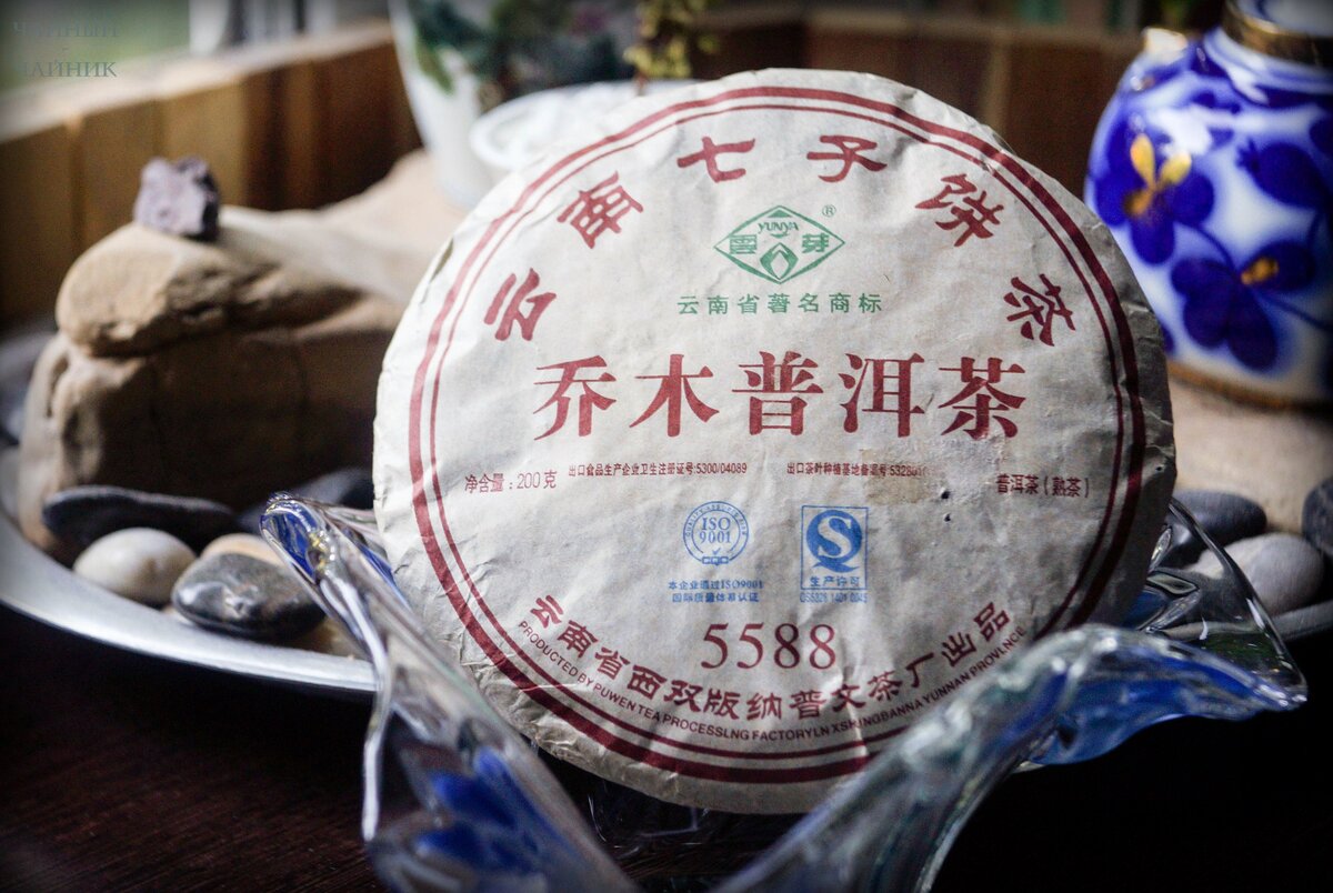 Шу пуэр "5588" 2015 года от Пу Вэнь Этим утром в моём чайном уголке появился новый знакомый Номерной шу пуэр "5588" 2015 года от Пу Вэнь. Общение с его предшественником оставило по себе приятные впечатления, поэтому при пополнении запасов шу на каждый я вновь обратился к ассортименту бренда "Юнь Я". Номерной купаж "5588" встречается в исполнениях шу и шэн Это серийный пуэр, приготовленный, если верить надписи на этикетке, из сырья с цяо му (乔木), кустообразных деревьев (или древовидных кустов?). В некоторых источниках можно встретить упоминание, что сырьё для купажей "5588" является плантационным (台地茶,тайдича). В любом случае, доступная цена (вполне реально найти в российской рознице за 500 рублей) говорит за чайное сырьё средней ценовой категории. Блинчик весит 200 грамм Лист среднего размера, с небольшим количеством почек и попадающимися иногда черенками. В аромате слышатся арбузные ноты и оттенки сладкого клевера, которые обволокла ореховая пелена. Прогретая посуда будит густую му