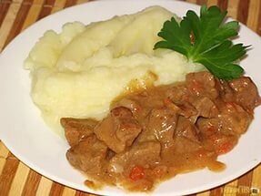Ингредиенты: говядина(свинина, курица, индейка) — 0,5 кг ; лук репчатый — 1 шт. ; морковка — 1 шт.( можно без нее ) ; мука — 1 столовая ложка ; томатная паста — 1 чайная ложка ; сметана — 1 столовая ложка (по желанию) ; лавровый лист — 1 шт. ; соль по вкусу — 0.5 ч.л примерно. Приготовление: нарезать мясо на небольшие кусочки, слегка обжарить ( можно не обжаривать, а сразу добавить в мясо немного кипятка) и потушить вместе с луком и тертой морковкой в собственном соку на несильном огне, немного налив в кастрюлю раст. масла. Затем долить небольшое количество воды. Ну скажем, на полкило мяса стакан воды. Тушить до готовности мяса ( т.е до мягкости). Мясо должно быть слегка прикрыто бульоном. Минут за 10 до готовности мяса, посолить по вкусу, положить лавровый лист — 1 шт. и можно 3 шт. перца горошком. Мясо бывает разное. Поэтому время приготовления может быть тоже разное. Но как правило около часа, не меньше ( если это говядина или свинина, а не цыпленок) Готовность про