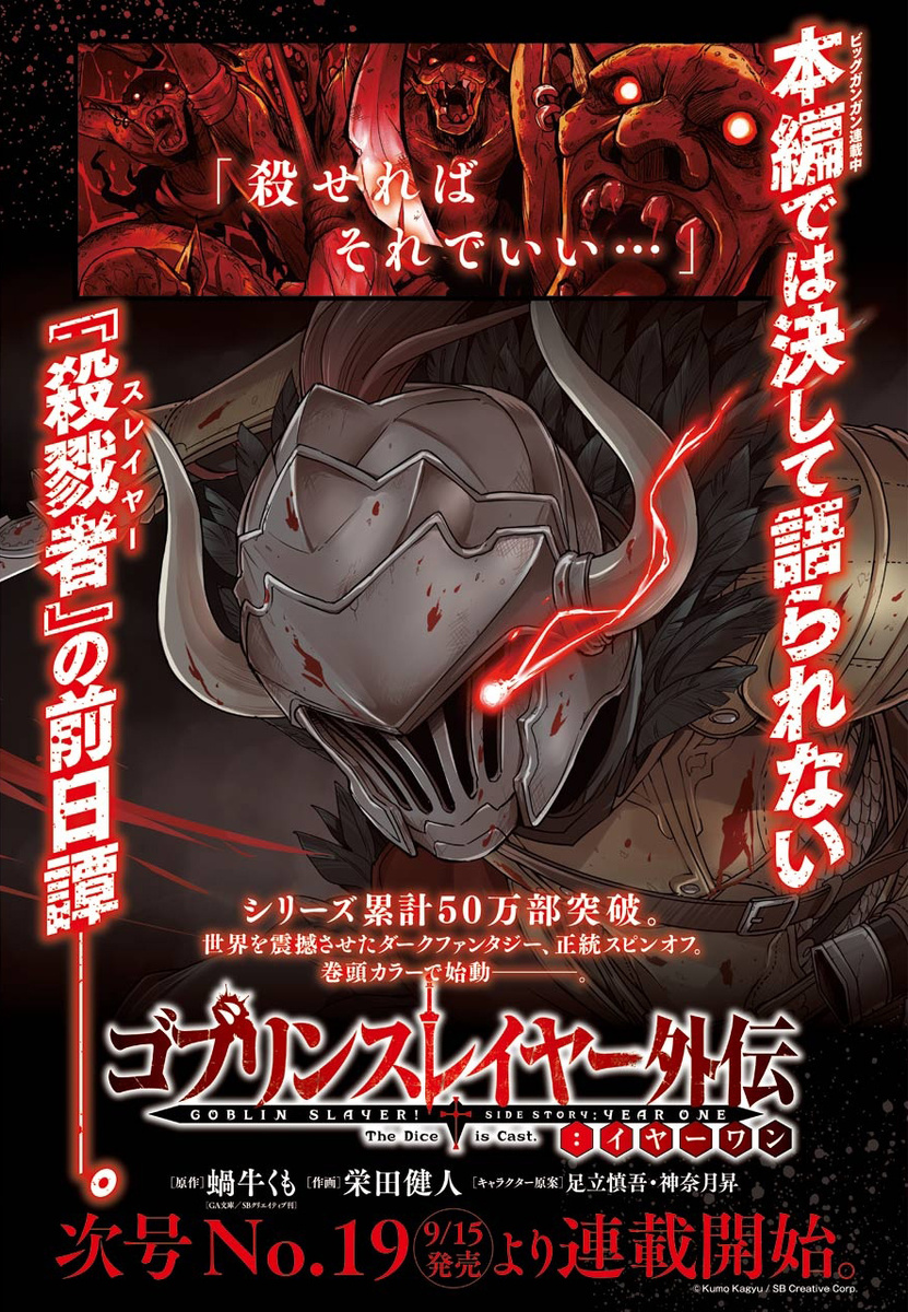 В 18 выпуске журнала Young Gangan была объявлена новость, что новелла в жанре "тёмное фэнтези" , имеющая уже манга-адапатцию, обзаведётся спин-офф мангой "Goblin Slayer: Side Story Year One", которая будет описывать события, происходившие до , а точнее — самое начало пути самого Убийцы Гоблинов, только что закончившего обучение у своего мастера.