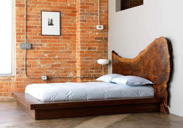 Спинка кровати из слэба дерева, которое сейчас очень популярно в интерьере и используется чаще всего в качестве стола. Ценник, к слову, у таких изделий колеблется в районе 200.000 руб.