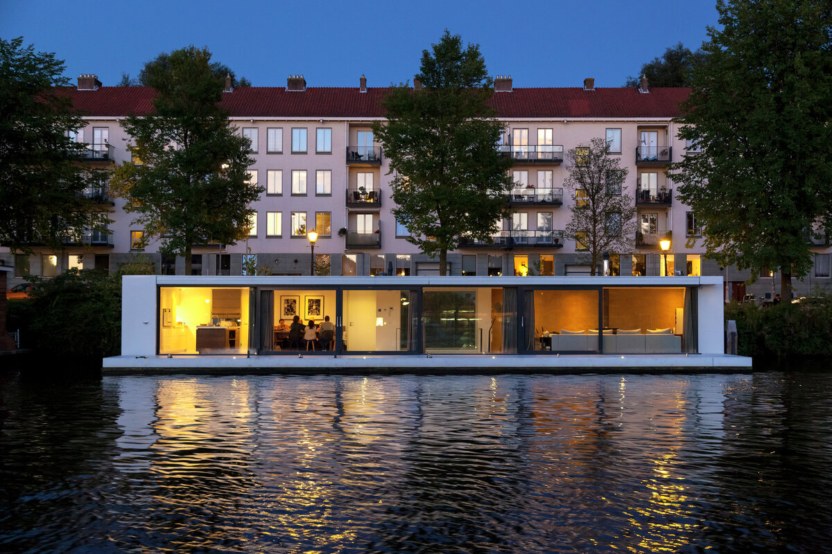 Проект Watervilla реализован студий +31ARCHITECTS в Амстердаме, Нидерланды. Этот жилой дом площадью 200 квадратных метров базируется на воде, что становится все более популярно в городе каналов. Один из фасадов плавучего дома полностью выполнен из стекла, тем самым открывая вид на реку Амстел из гостиной зоны, совмещающей комнату отдыха, кухню и столовую. Раздвижные двери предлагают выход на террасу, откуда так и хочется нырнуть в воду. При этом три больших экрана защищают внутреннее пространство от солнца одним нажатием кнопки. С обратной же стороны алюминиевый фасад пронизан многочисленными отверстиями, образующими узор в виде номера дома. На нижний уровень резиденции можно спуститься по парящей в воздухе лестнице. Там спроектированы спальни и ванные комнаты. Фотографии: Ewout Huibers Смотрите также: Частный дом в Амстердаме от Marc Prosman Architecten Источник